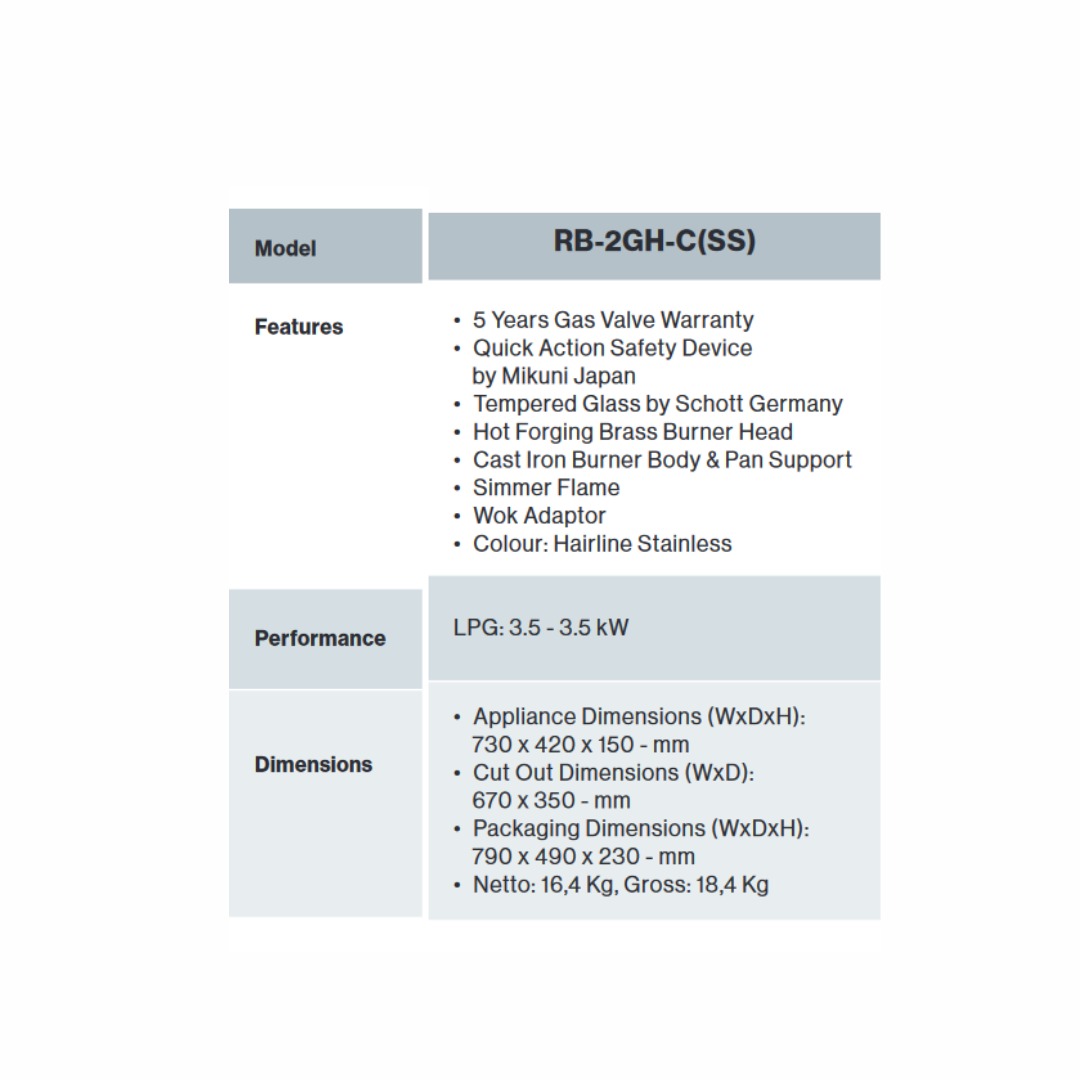 Rinnai - Gas Hob - RB-2GH-C (SS) adalah Kompor dengan dua tungku yang di lengkapi finishing stainless steel hairline memberikan tampilan dapur yang sederhana, fungsional, dan modern. Jadikan dapur anda bukan hanya sekadar ruang untuk memasak, tetapi juga menjadi elemen penting dalam desain interior yang estetis untuk rumah. Kompor ini memiliki body dari bahan stainless steel, yang membuatnya kuat, tahan terhadap karat, dan memiliki daya tahan yang panjang.