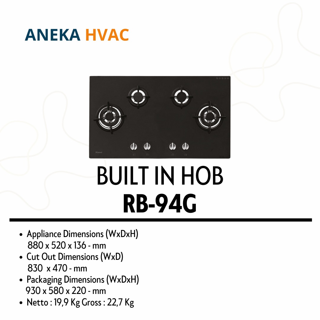 Rinnai - Gas Hob - RB-94G adalah desain yang sederhana dan cocok untuk melengkapi dapur Anda. Kompor ini mudah digunakan, dilengkapi dengan fitur child lock untuk keamanan, serta memiliki bodi yang kuat dan tahan lama.