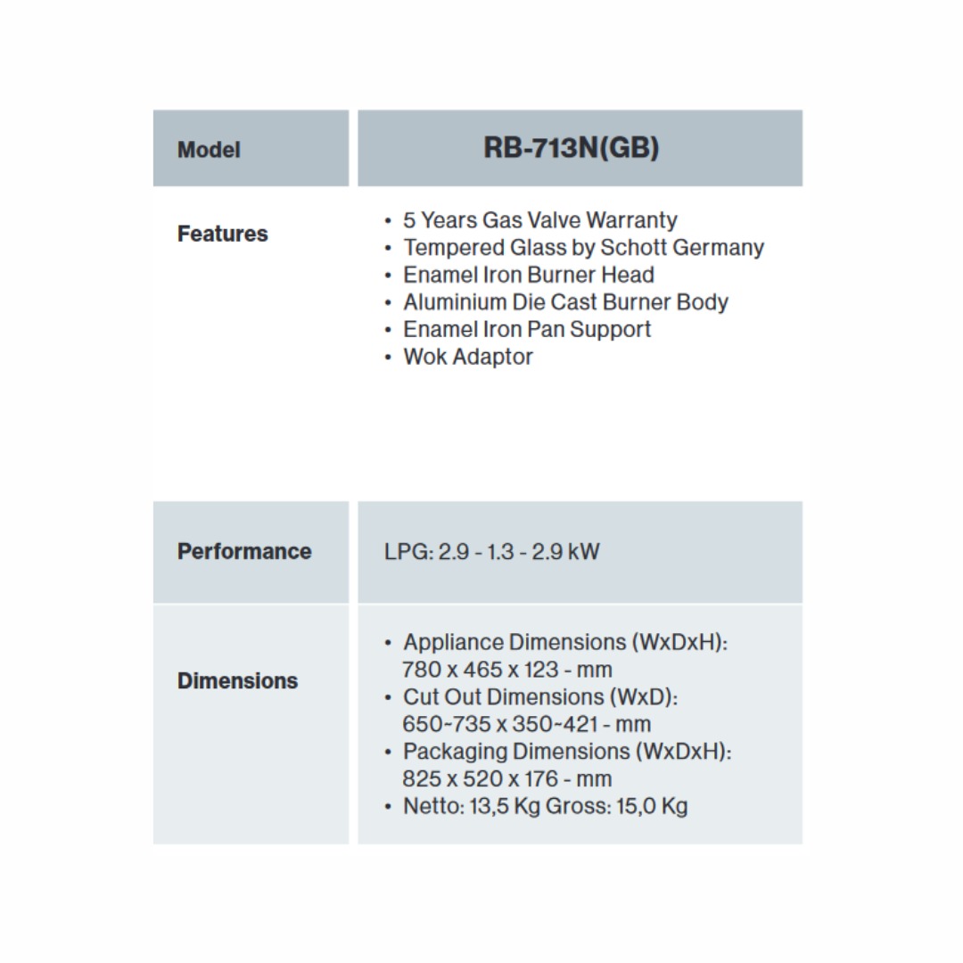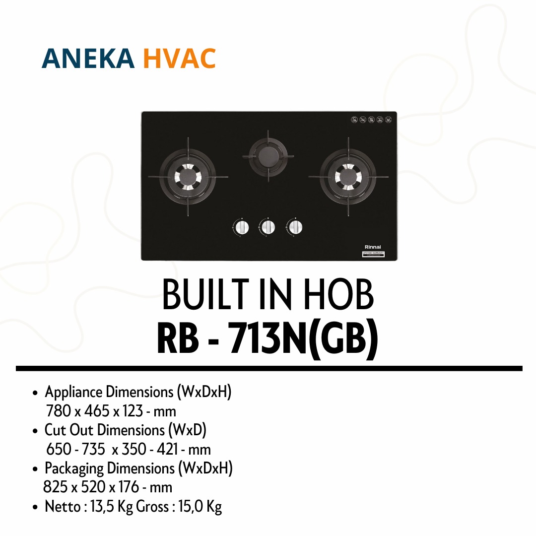Rinnai - Gas Hob - RB-713N(GB) adalah kompor tanam ini hadir dengan desain yang minimalis, ideal untuk menyempurnakan tampilan dapur Anda. Penggunaannya praktis, dilengkapi fitur child lock untuk keamanan anak, dan bodinya kokoh serta tahan lama.