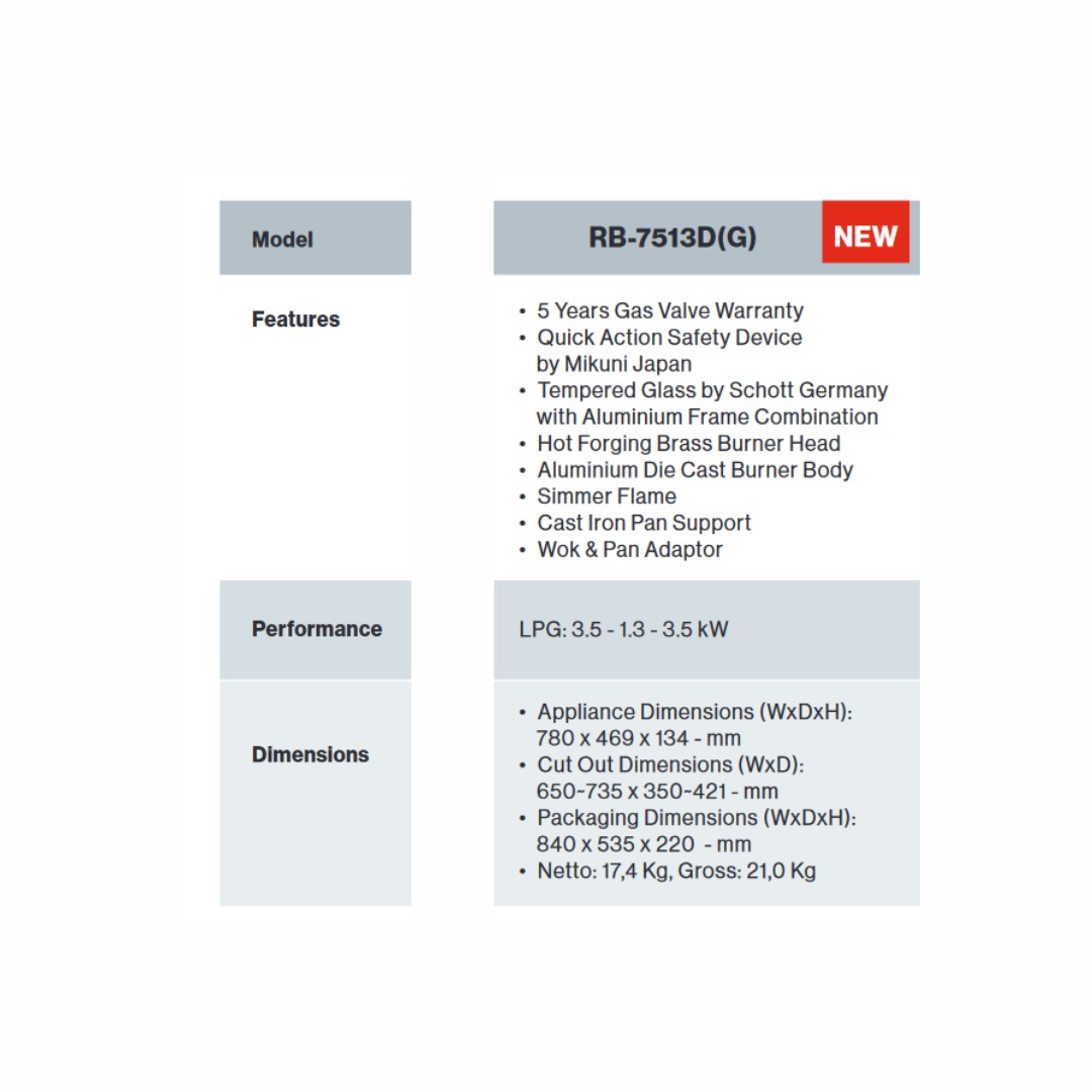 Rinnai - Gas Hob - RB-7513D(G) adalah kompor tanam tiga tungku yang dilengkapi top plate berbahan tempered glass dari Schott Germany, ini memberikan tampilan kompor anda lebih mewah dan elegan. Kompor ini juga terdapat tempered glass yang memastikan kualitasnya tetap terjaga.