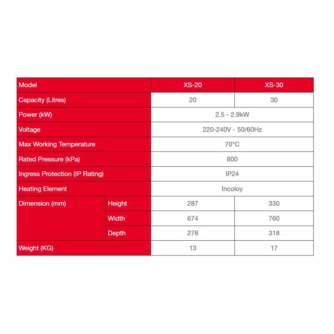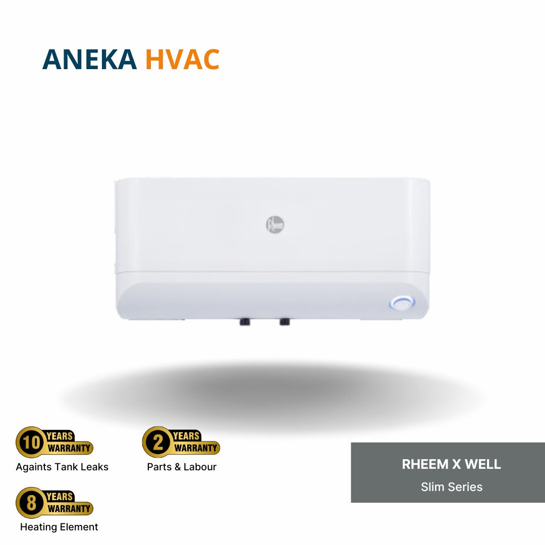 Rheem- Xwell - Slim Series tersedia dalam kapasitas penyimpanan 20 dan 30 liter, terdapat Diffuser RheemHot+ ™ Eksklusif yang memberikan lebih banyak air panas untuk mandi lebih lama dan Lapisan enamel RheemGlas ™ dalam tangki untuk meminimalkan korosi dan memperpanjang umur tangki.