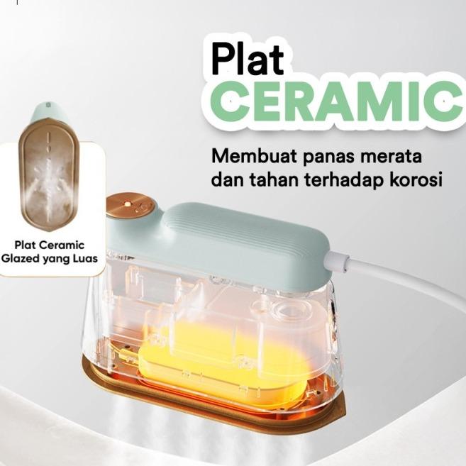 Pegangan lipat 180°, jarak semburan uap hingga 40 cm, output uap mencapai 14 mL/menit.