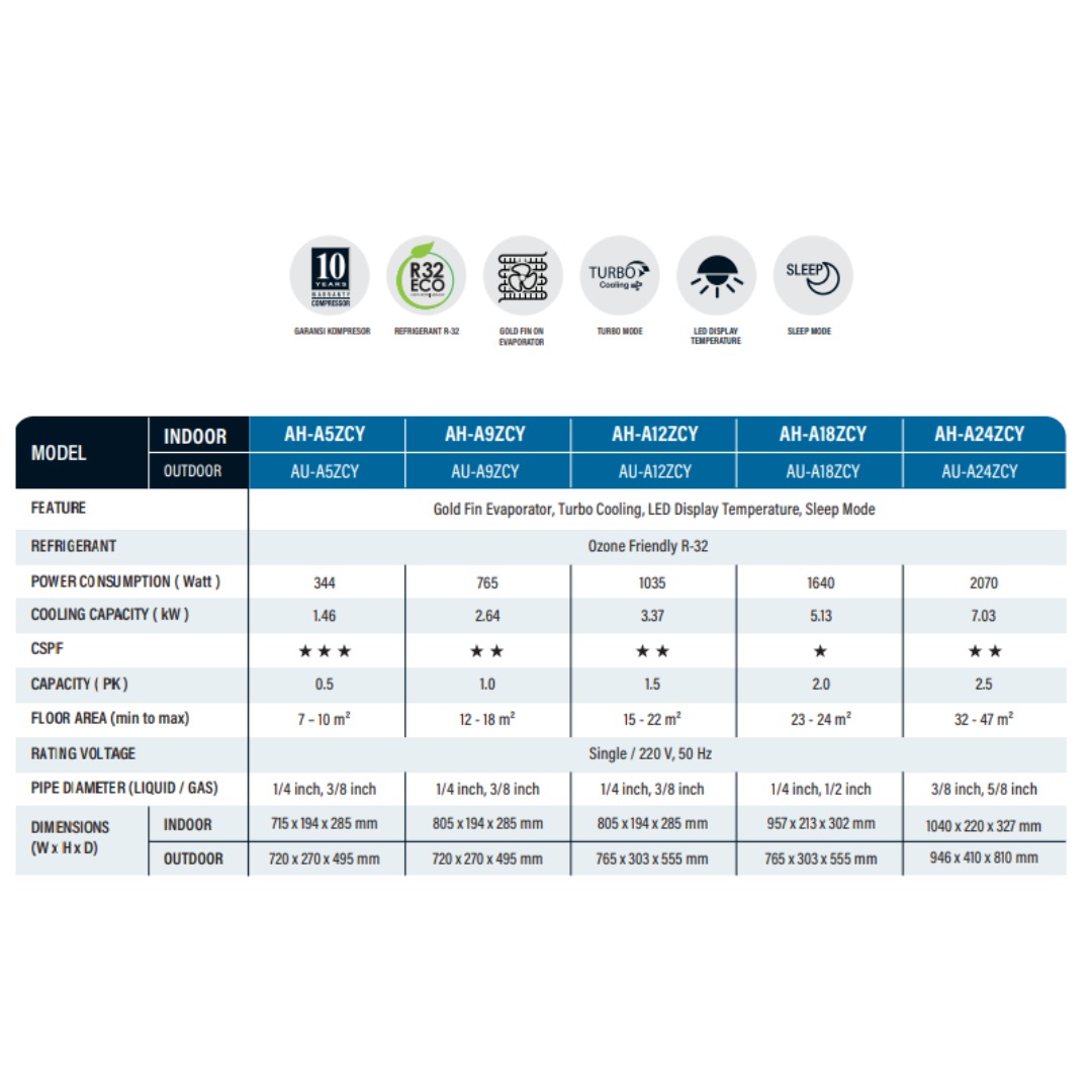 AC Sharp ZCY Series merupakan pilihan tepat untuk kebutuhan pendinginan ruangan komersial maupun hunian modern. Dengan teknologi inverter yang efisien, AC ini mampu memberikan pendinginan cepat, stabil, dan hemat listrik. Kualitas material yang kokoh serta performa khas Sharp menjadikan ZCY Series andal untuk penggunaan jangka panjang.