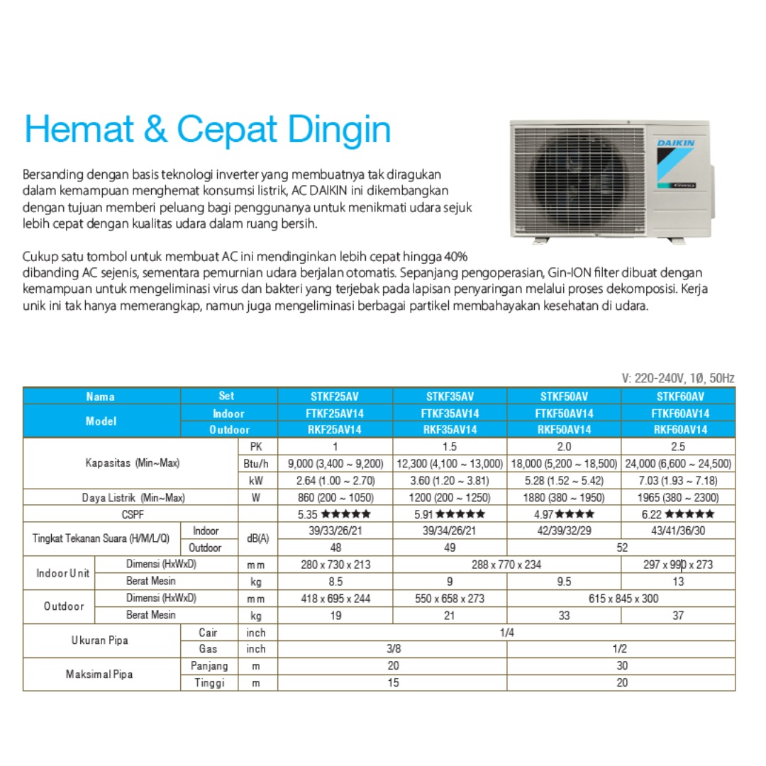 Cocok digunakan untuk hunian maupun ruang kerja, AC Daikin FTKF Series menawarkan pendinginan cepat, suara operasional yang halus, serta kualitas dan daya tahan khas Daikin. Desain modern dan perawatan yang mudah menjadikannya pilihan ideal untuk penggunaan jangka panjang.