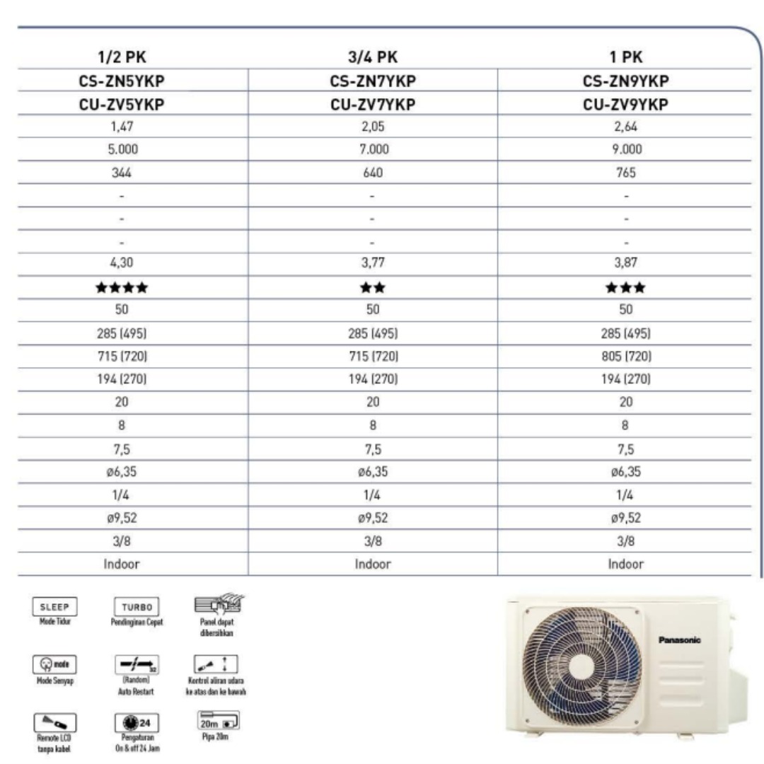 AC Panasonic ZN Series (YKP) hadir sebagai solusi pendinginan nyaman, stabil, dan efisien untuk kebutuhan hunian maupun ruang kerja. Seri standar ini dirancang untuk memberikan kesejukan yang konsisten dengan performa andal khas Panasonic, cocok untuk penggunaan harian.