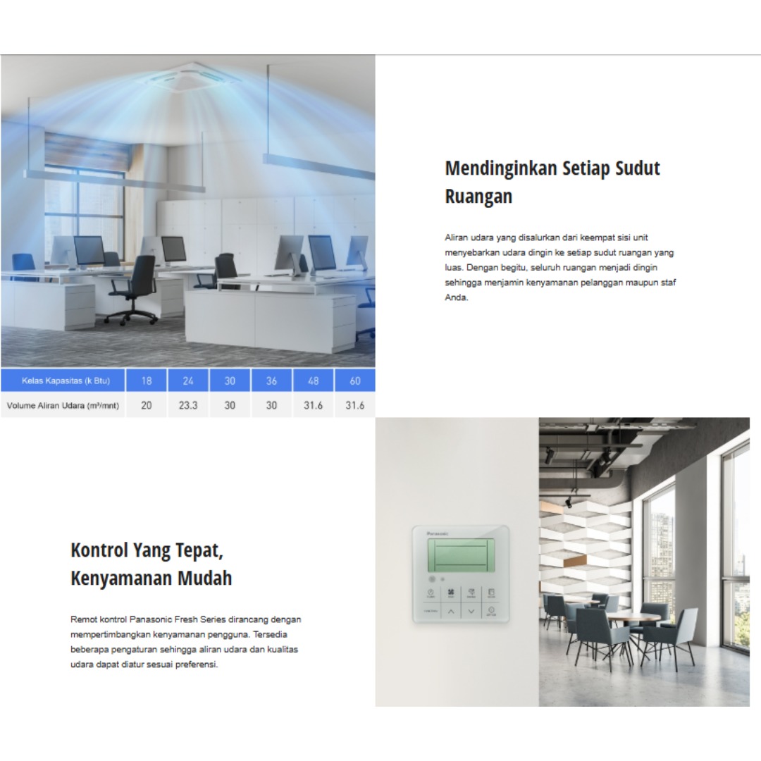 AC Panasonic 4-Way Cassette Fresh Series Non Inverter R32 dirancang khusus untuk kebutuhan ruang komersial dan publik yang membutuhkan pendinginan merata sekaligus sirkulasi udara segar. Dengan sistem hembusan 4 arah, udara dingin dapat tersebar secara optimal ke seluruh area ruangan, menciptakan kenyamanan yang konsisten.