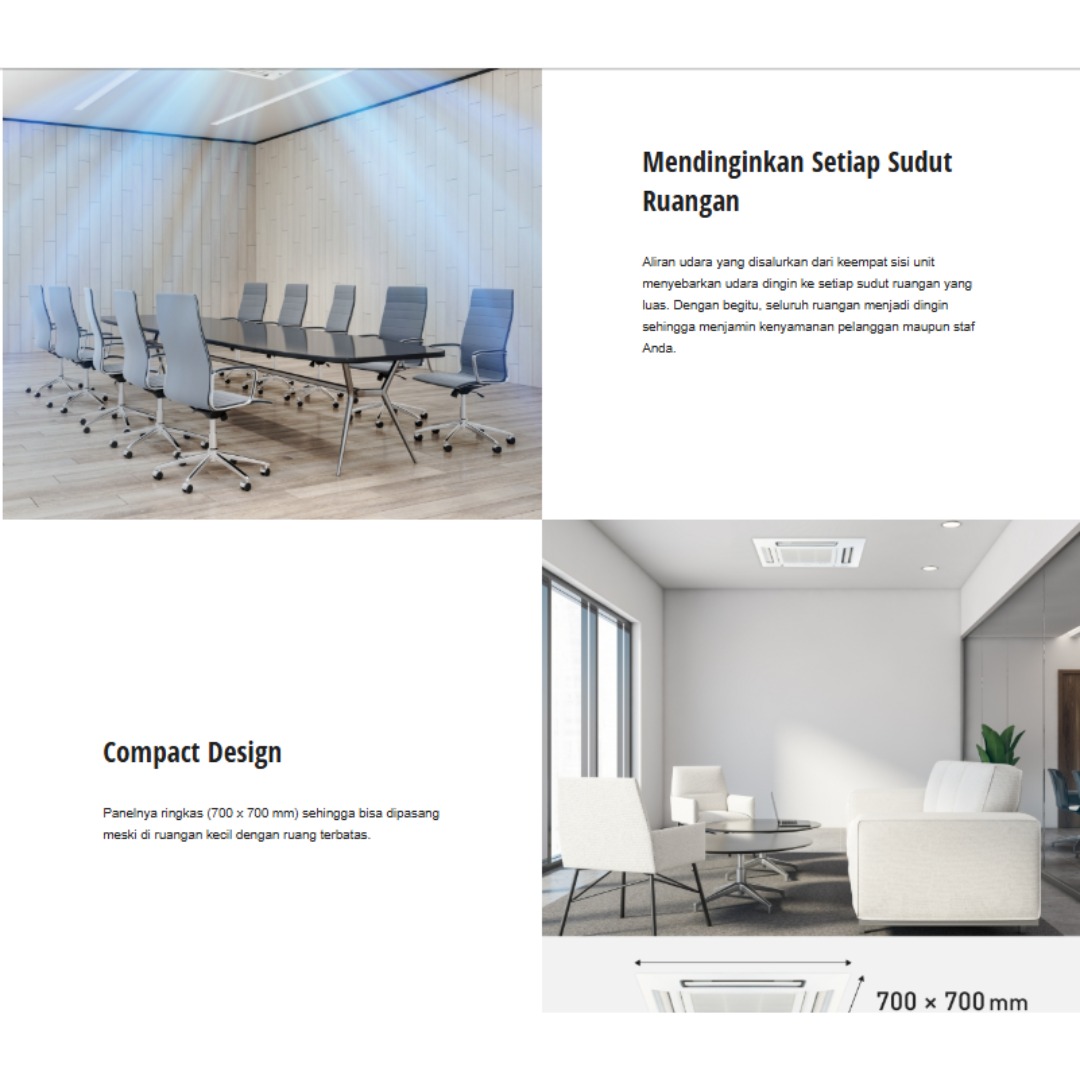 Menggunakan refrigerant R410A, AC ini mampu menghasilkan pendinginan yang efektif serta lebih ramah lingkungan. Tampilannya yang rapi dan profesional menjadikannya pilihan tepat untuk kantor, toko, ruang meeting, restoran, dan area komersial lainnya.