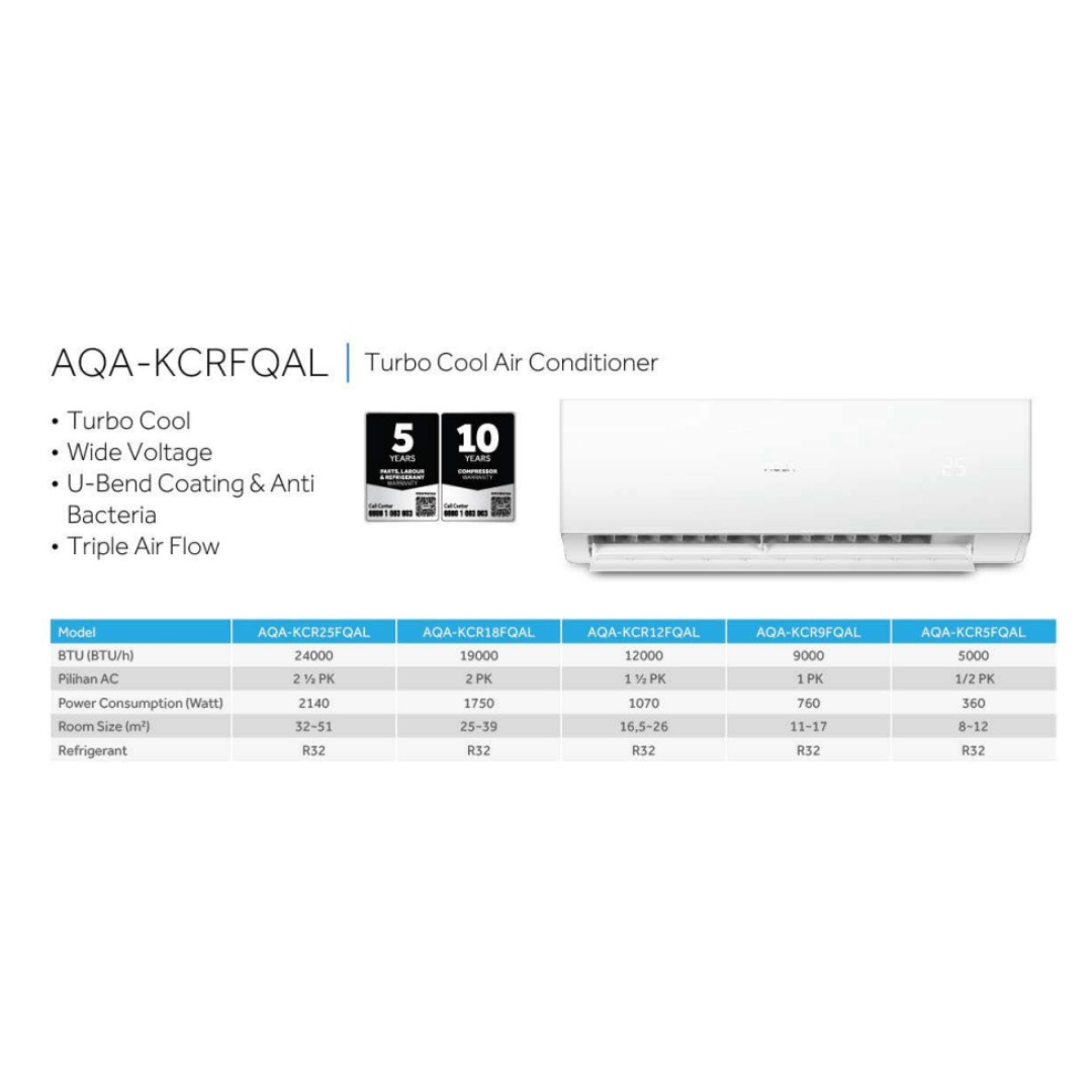 Dengan desain modern dan minimalis, AQUA AQA-KCRFQAL cocok digunakan untuk rumah tinggal, apartemen, maupun ruang kerja. Pilihan tepat bagi Anda yang menginginkan AC standar dengan performa cepat, handal, dan tahan lama.