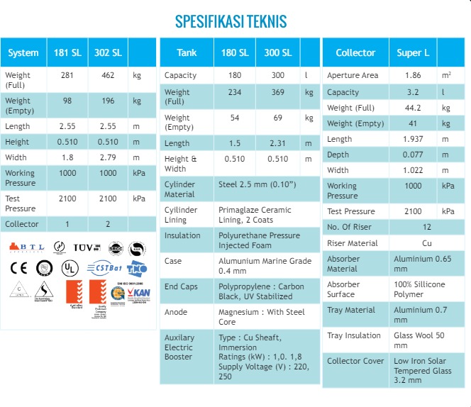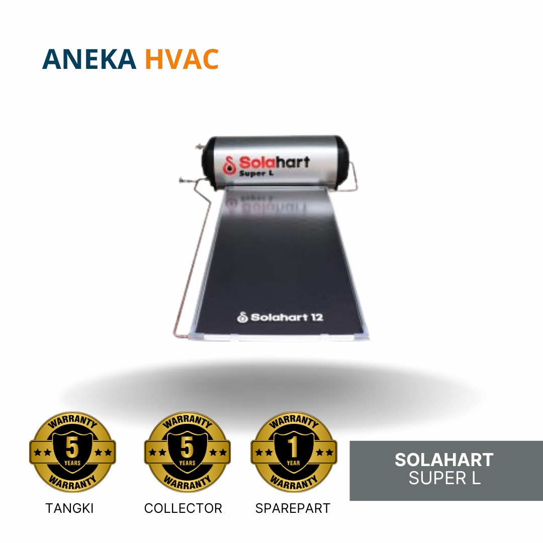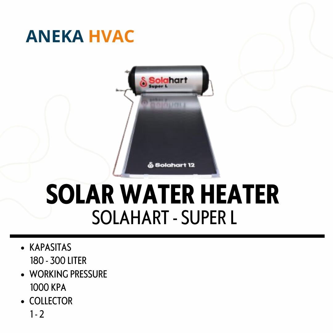 Solahart Super L Series, Teknologi Solar Water Heater yang dapat memenuhi kebutuhan dan kepuasan pemakai. Sistem kerja pemanasan air pada Solahart Direct Heating System yaitu air baku dipanaskan secara langsung di collector oleh sinar matahari dan disimpan didalam tangki. Sistem kerja ini disebut Thermosiphon. Solahart super l ini ada tipe 181, 182, 302, 303 dan kapasitas tangki ada 180 - 300 liter. Untuk yang 180 bisa untuk 5-6 orang, dan untuk yang 300 liter untuk 8 orang.
