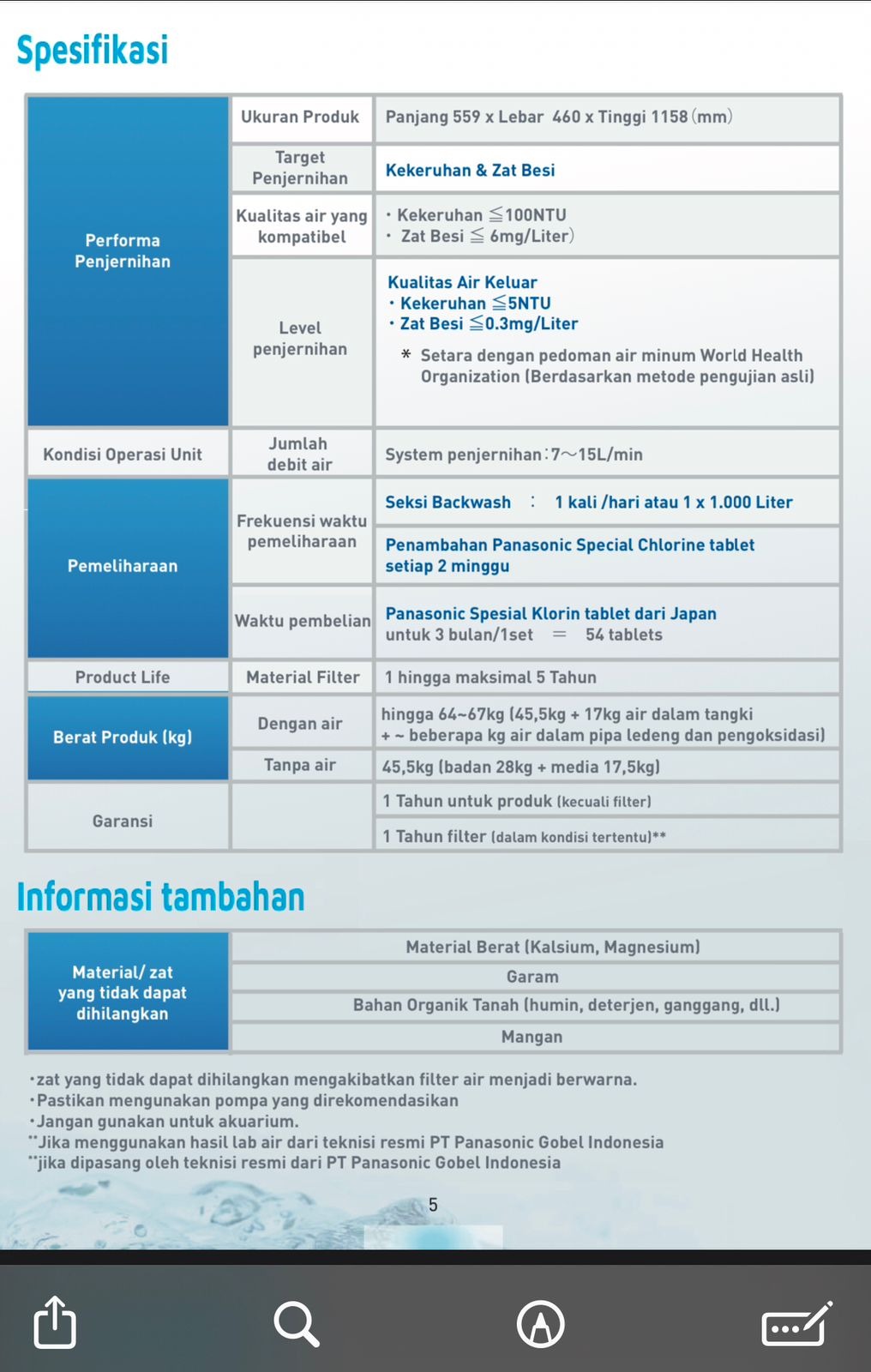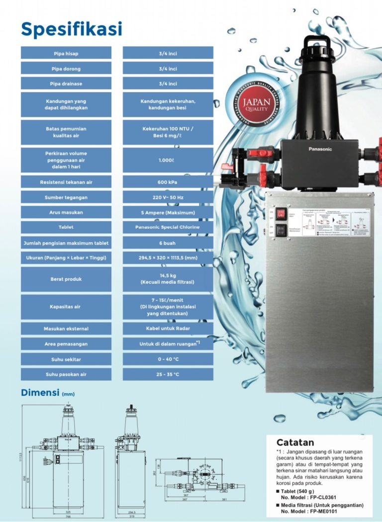 Panasonic water filter memiliki 2 tipe yaitu FP-15AM1M yang menjadi solusi untuk menjernihkan air sumur menjadi lebih bersih dan tipe Water Purification System FP-10LMSM1 solusi untuk air yang jernih untuk kebutuhan sehari-hari termasuk mencuci pakaian, menyikat gigi, mencuci pakaian, dan banyak lagi.