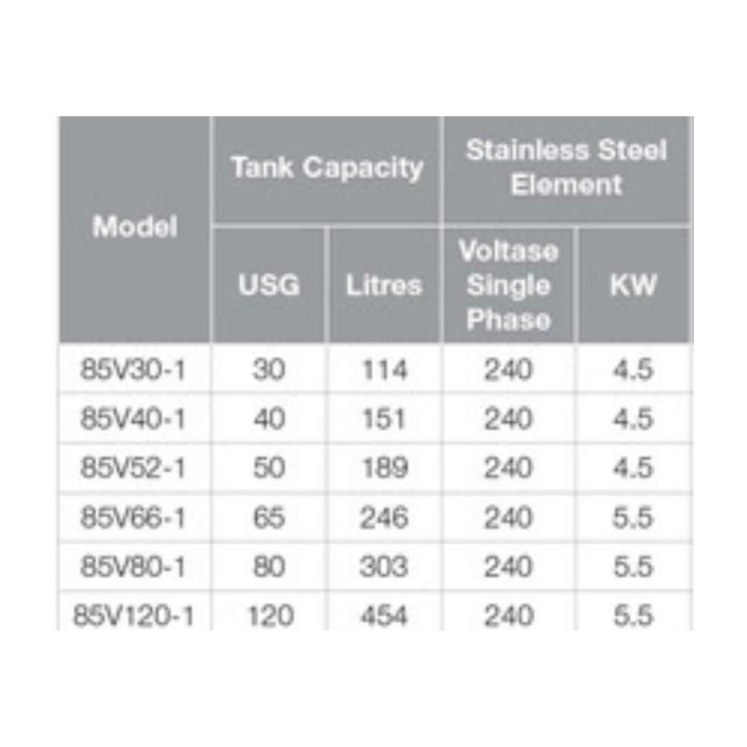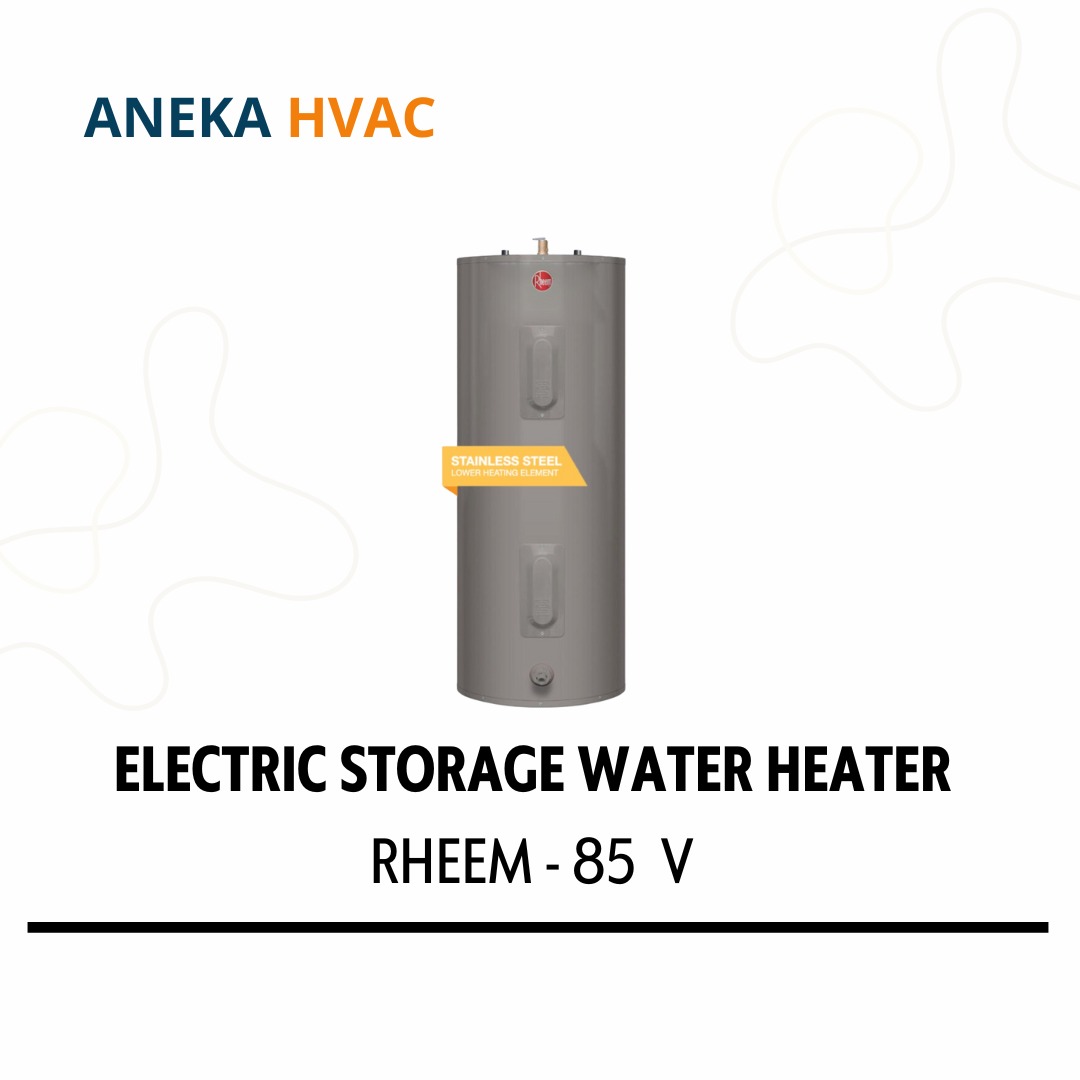 Rheem Electric Water Heater - 85 V series ini dirancang dengan elemen pemanas bawah berbahan baja tahan karat dan batang anoda bermutu premium, terdapat elemen pemanas stainless steel, insulasi padat meminamilisir heat loss, dan performa tinggi dengan biaya operasional yang rendah.