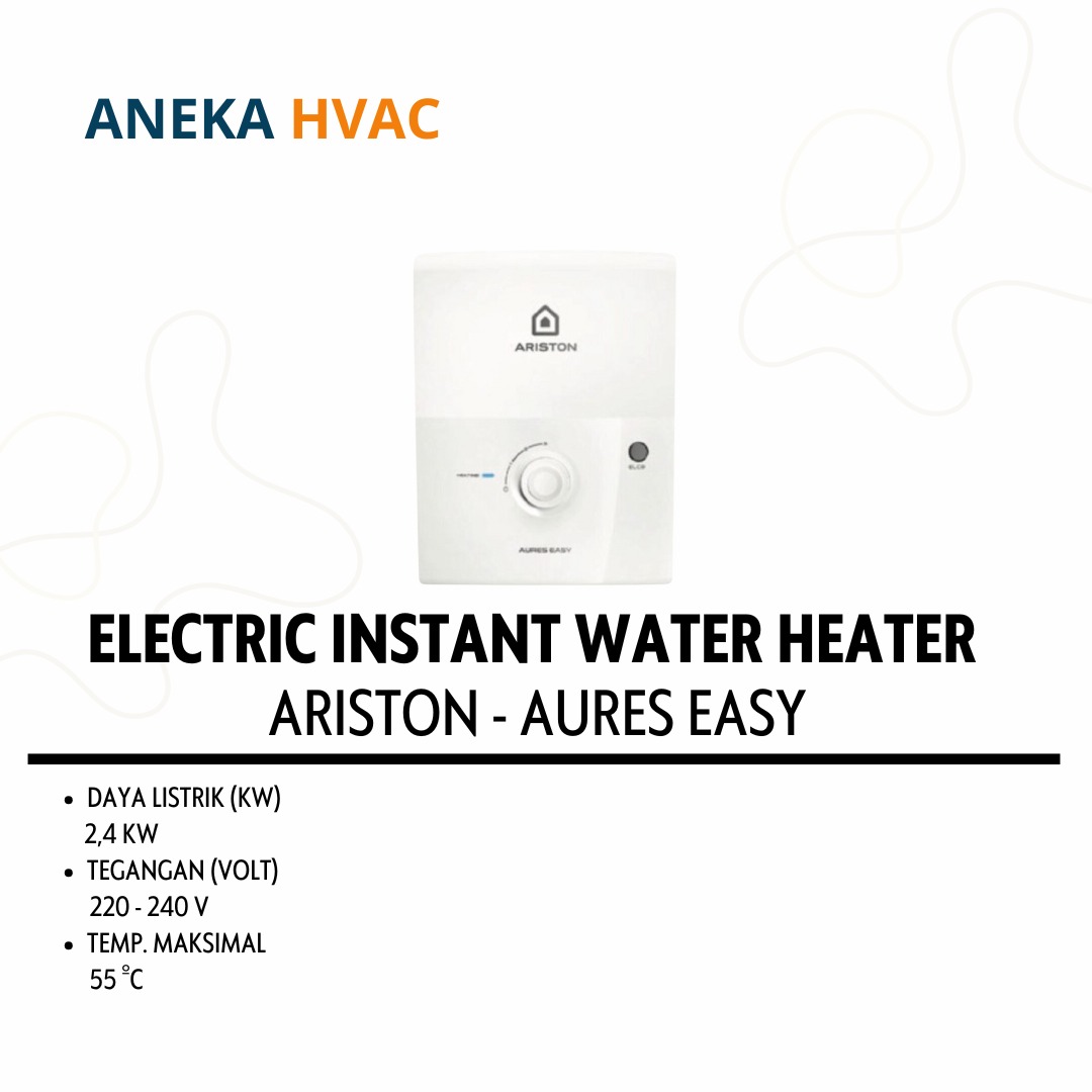 Ariston - Aures Easy ini memiliki penggunaan dan perawatan yang mudah, jaminan keamanan dan kualitas sehingga untuk penggunaan air lebih hemat dengan adanya flow restrictor, serta daya listrik mulai dari 700 watt
